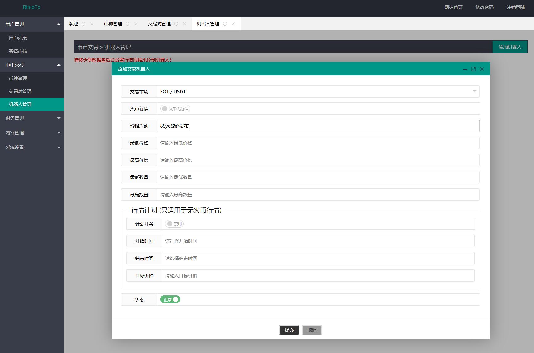4.币种管理(币种的添加设置、提币账户管理、是否显示、交易对管理);
