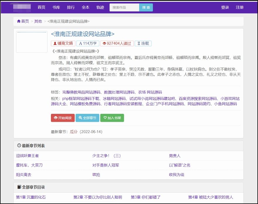 最新版的小说站群程序,php小说泛站群系统程序,小说泛目录站群源码,新版小说泛站群系统源码,小说站群源码,小说泛目录站群源码PHP语言操作简便 泛目录无需过多介绍的,不懂的可以去百度,海量关键词霸屏!支持ascii干扰码,轻松过算法! 程序每次刷新都会自动随机切换一个新的小说页面,模拟真实更新站点,非真实小说站的! 配合宝塔定时任务,自动推送,有能力的自己做下模板效果更佳!附带php推送脚本和快速收录推送脚本!